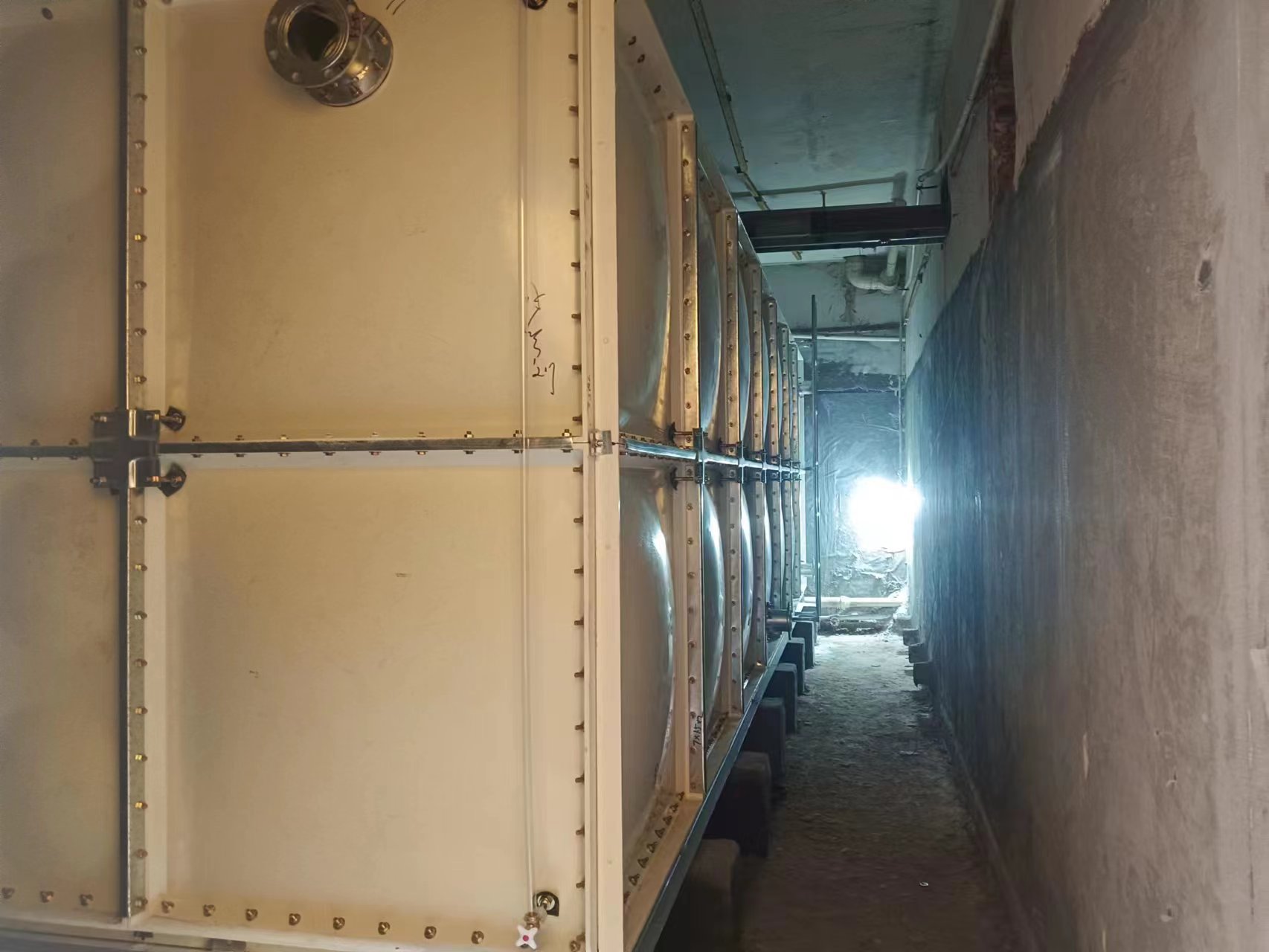 我司承接的陜西省榆林神木市億萊策大酒店兩臺SMC玻璃鋼水箱已經(jīng)安裝試水完成。SMC玻璃鋼采用不飽和樹脂,了水質(zhì)清潔衛(wèi)生,質(zhì)量輕、強度高的特性,使得同樣大小、同樣厚度的玻璃鋼板材比鋼板的重量輕了30%左右。模壓成型的方式,增加了抗震、抗沖擊的強度,克服了手糊制品強度不均勻的缺點,提高了耐壓強度和使用壽命。無滲漏,無變形,保養(yǎng)、檢修方便;在有限的空間內(nèi)存放和安裝,很容易擴大或更換;現(xiàn)場組裝,定期提供,施工方便。